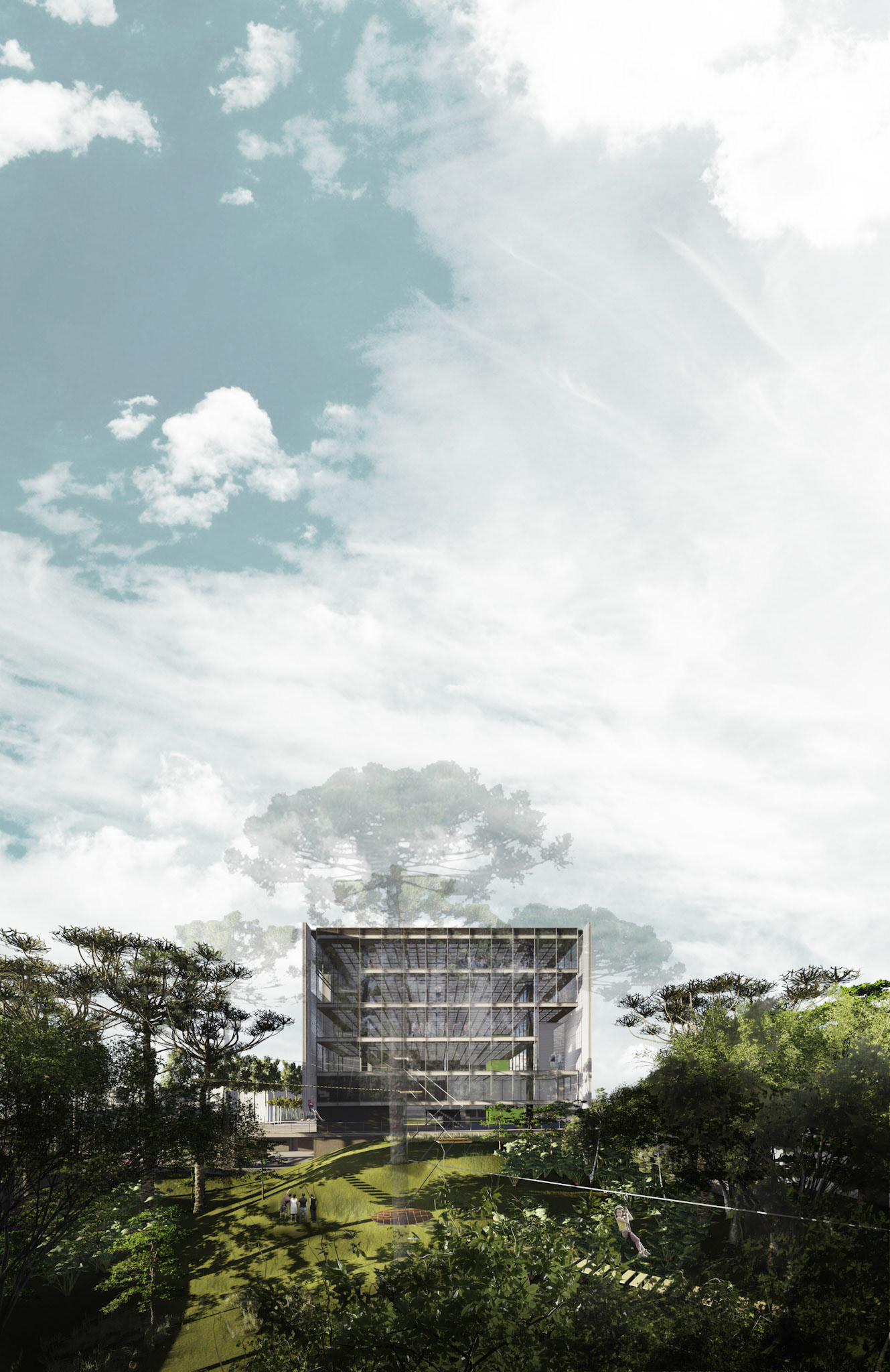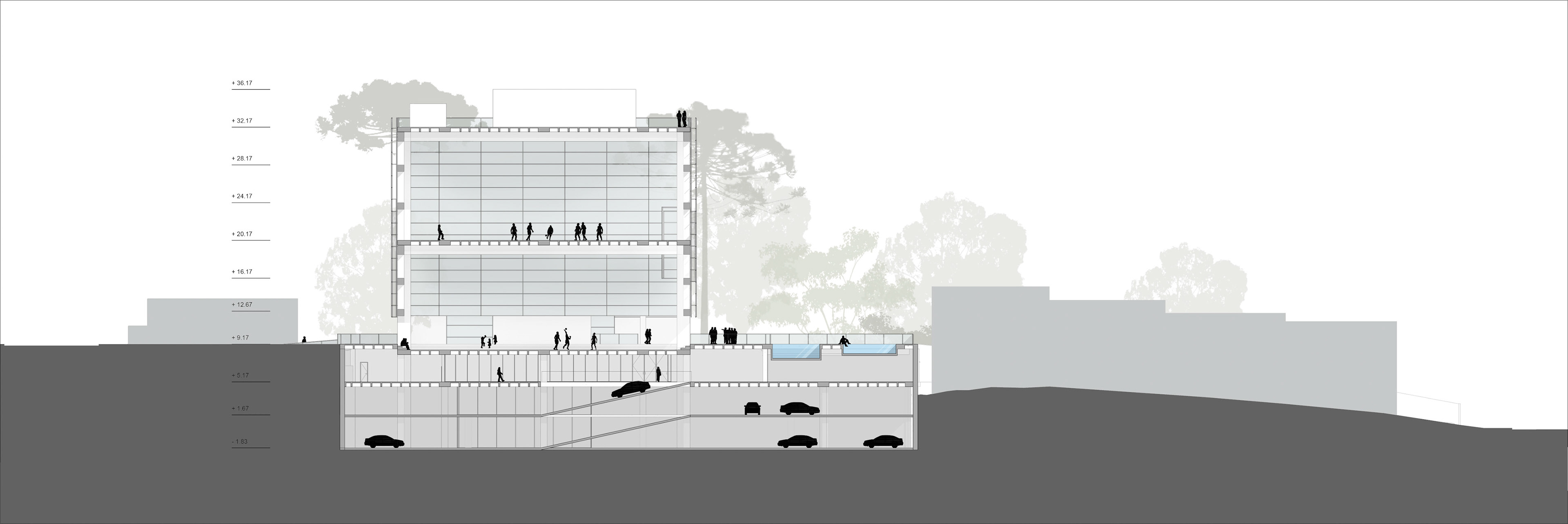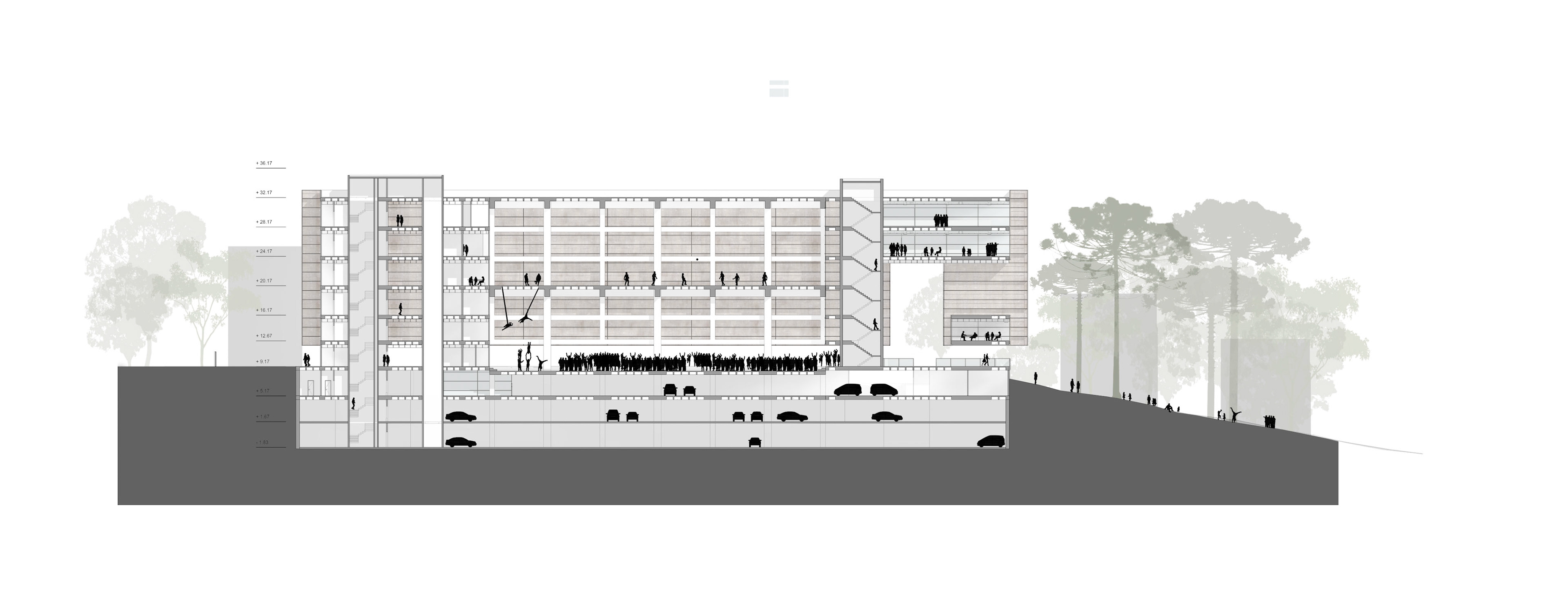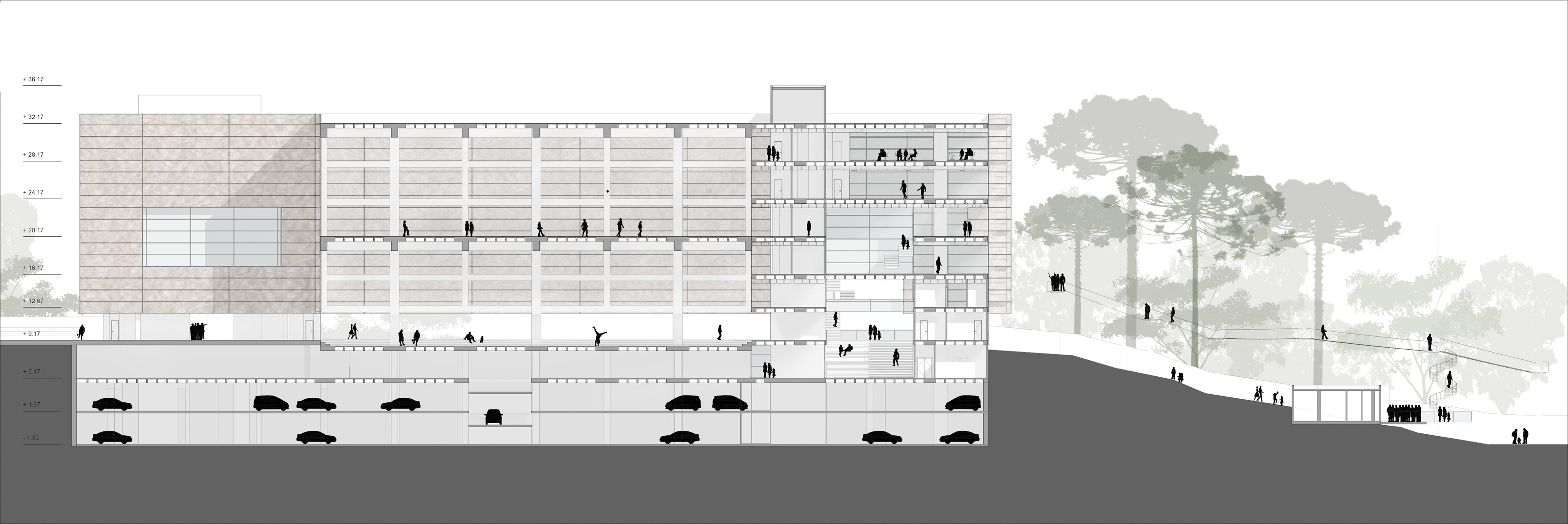 1ere position Proposition gagnante d’un concours fermé où trente bureaux les plus prestigieux de Curitiba ont participé. Situé dans un terrain avec un site classé et dans une zone non appropriée a la construction, ce projet a été un défi du début à la fin. L’édifice a pour concept principal les connexions, soit internes soit externes. Le Club Curitibano est le plus traditionnel de la ville, raison pour laquelle il devrait avoir cette communication avec son entourage. Ce concept allié aux solutions actuelles de confort environnemental a résulté à l’utilisation d’une façade complètement perméable, qui permettait le maximum de visibilité et qui en même temps protégeait l’édifice de l’incidence solaire. La façade choisie a été un système ventilé textile qui a permis un volume unique, créant une unité de grand impact visuel. ArchDaily - https://www.archdaily.com.br/br/626215/primeiro-lugar-no-concurso-para-nova-sede-do-clube-curitibano-arqbox-arquitetura