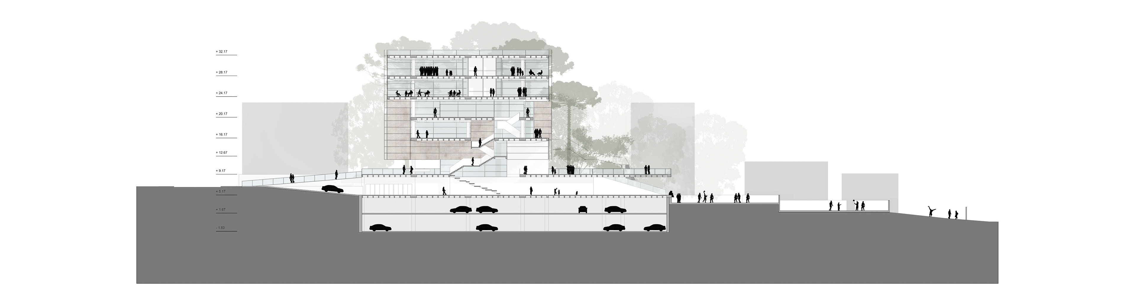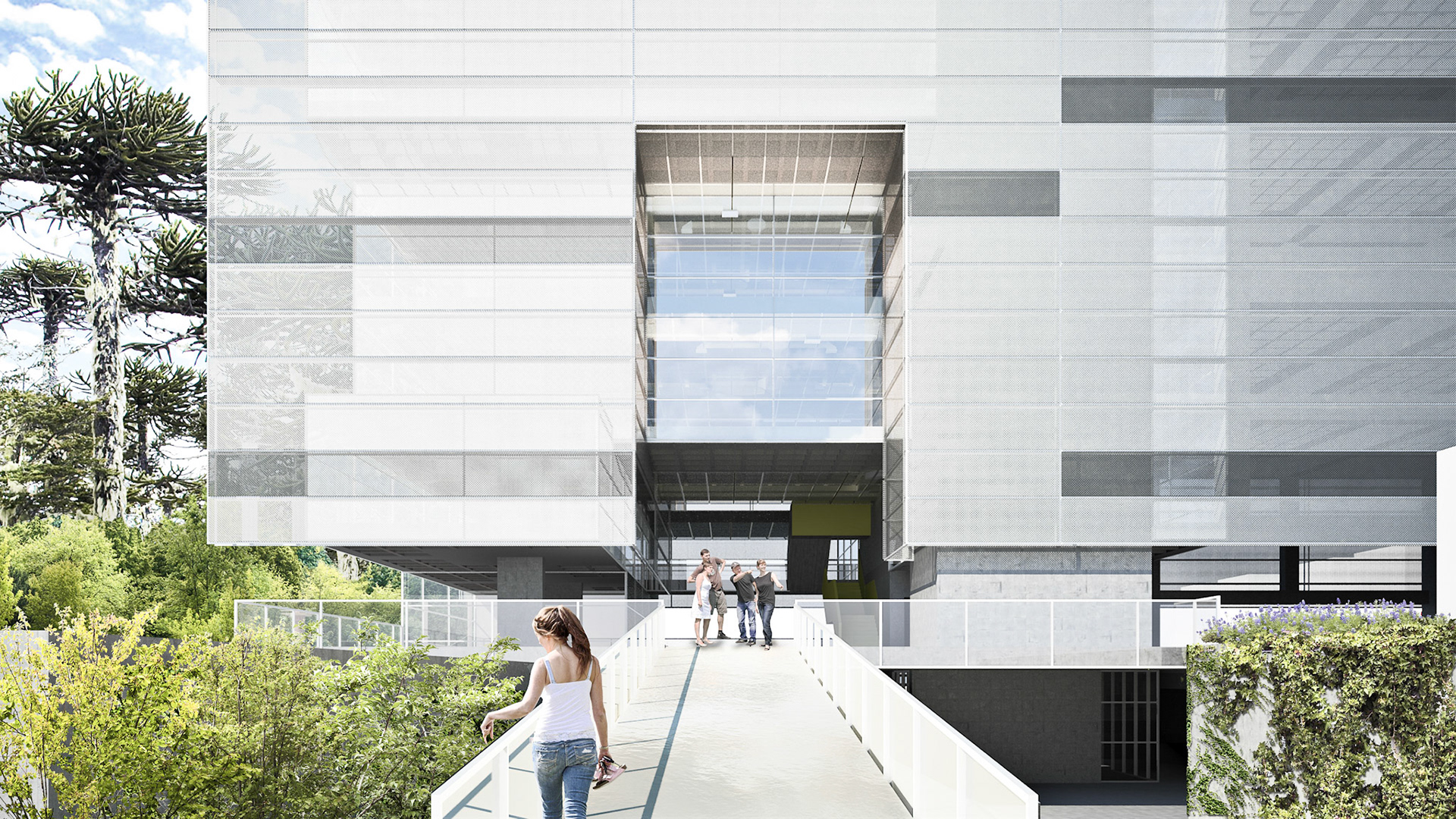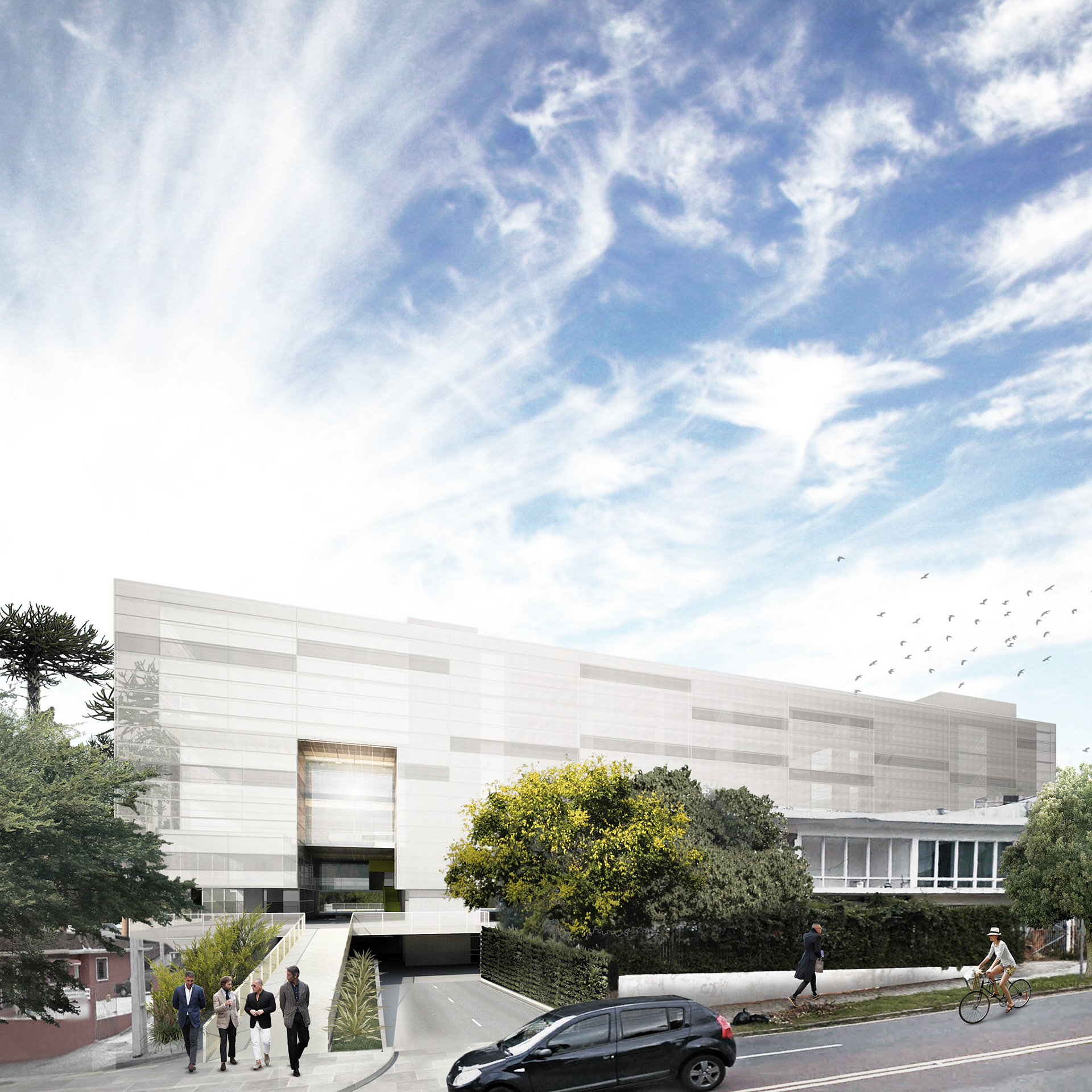 1ere position Proposition gagnante d’un concours fermé où trente bureaux les plus prestigieux de Curitiba ont participé. Situé dans un terrain avec un site classé et dans une zone non appropriée a la construction, ce projet a été un défi du début à la fin. L’édifice a pour concept principal les connexions, soit internes soit externes. Le Club Curitibano est le plus traditionnel de la ville, raison pour laquelle il devrait avoir cette communication avec son entourage. Ce concept allié aux solutions actuelles de confort environnemental a résulté à l’utilisation d’une façade complètement perméable, qui permettait le maximum de visibilité et qui en même temps protégeait l’édifice de l’incidence solaire. La façade choisie a été un système ventilé textile qui a permis un volume unique, créant une unité de grand impact visuel. ArchDaily - https://www.archdaily.com.br/br/626215/primeiro-lugar-no-concurso-para-nova-sede-do-clube-curitibano-arqbox-arquitetura